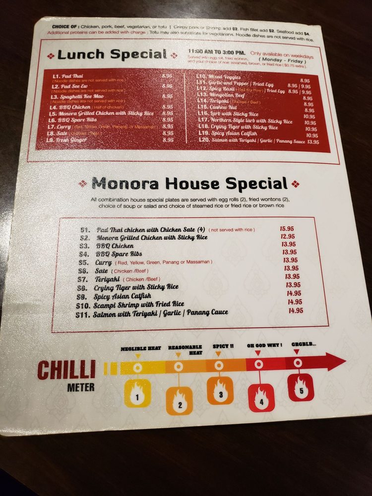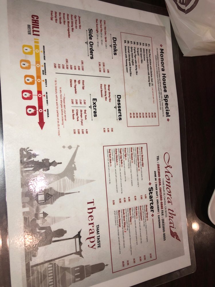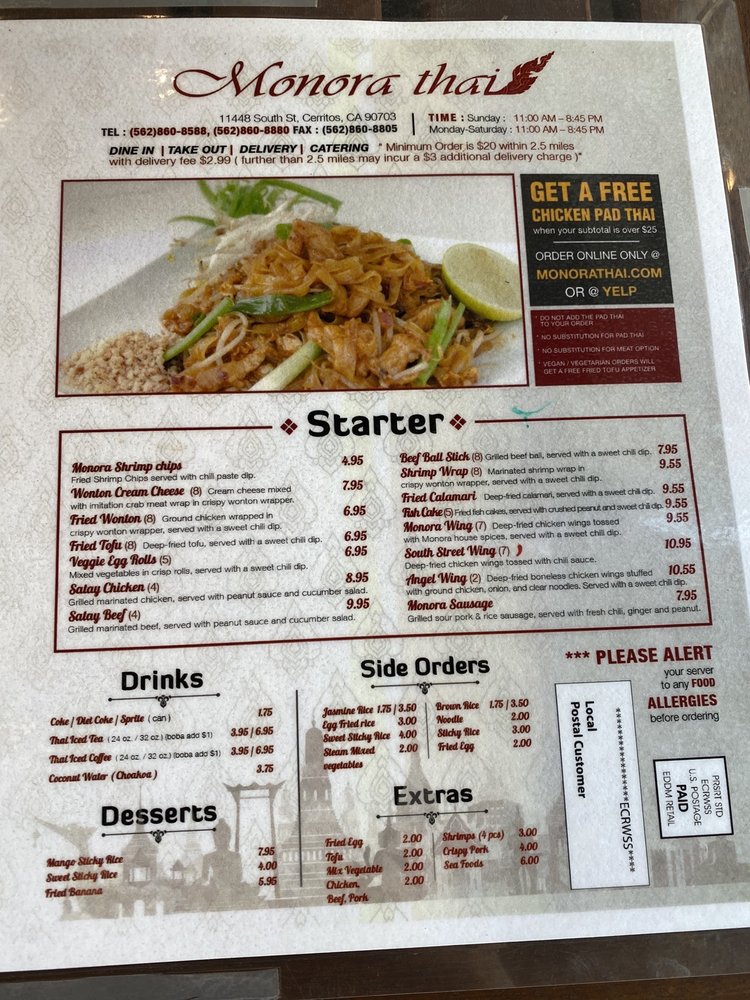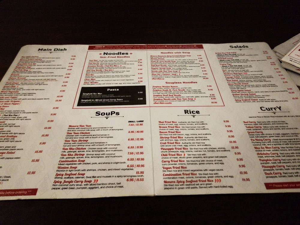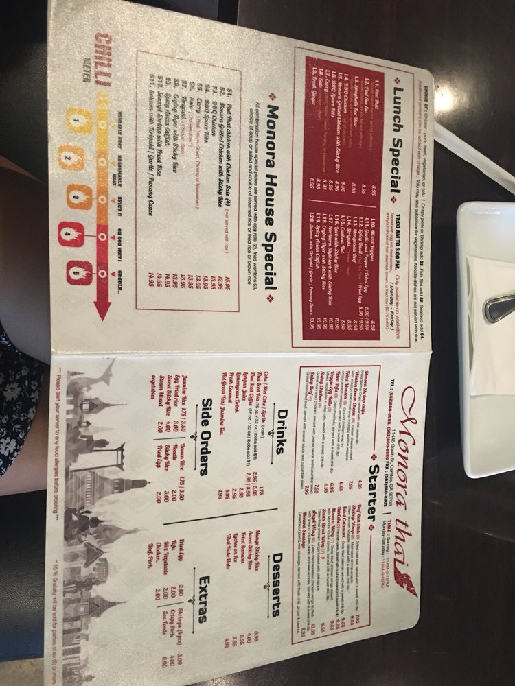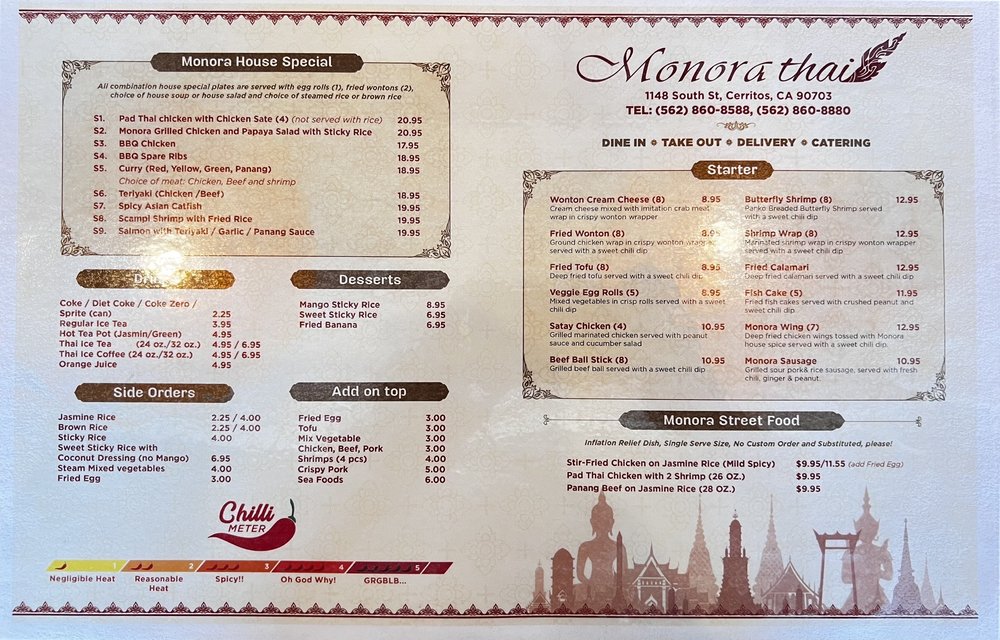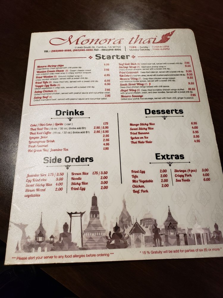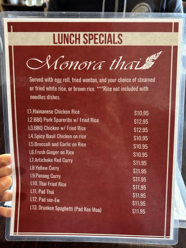Monora Thai - Cerritos in California offers a wide array of Thai dishes with various options for vegans and vegetarians. The restaurant provides delivery, takeout, reservations, and even catering. Their menu includes popular dishes like Pad Thai and Shrimp Fried Rice, which customers rave about for their delicious flavors and generous portions. The lunch specials are a great deal, with dishes like Pad See Ew and Pad Thai priced at $11.95. Customers love the lightning-fast service, spacious seating, and the option to bring your own container for leftovers. The spicy basil squid, panang curry, and pad see ew are highly recommended choices among diners. Monora Thai stands out for its consistent quality, making it a favorite Thai spot among locals.